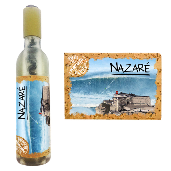 Magnetic in 11,5x2,5cm, bottle format, with capsule openers and corkscrews. Application of printed natural cork, in individual packaging.