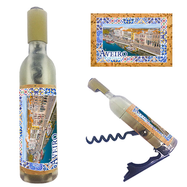 Magnetic in 11,5x2,5cm, bottle format, with capsule openers and corkscrews. Application of printed natural cork, in individual packaging.