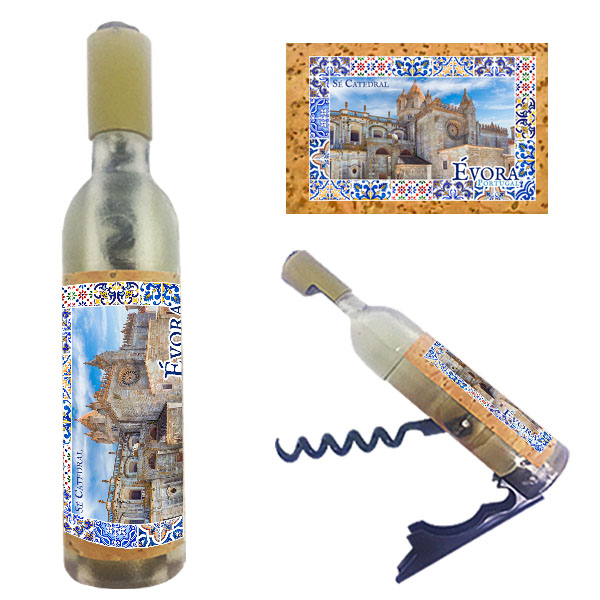 Magnetic in 11,5x2,5cm, bottle format, with capsule openers and corkscrews. Application of printed natural cork, in individual packaging.