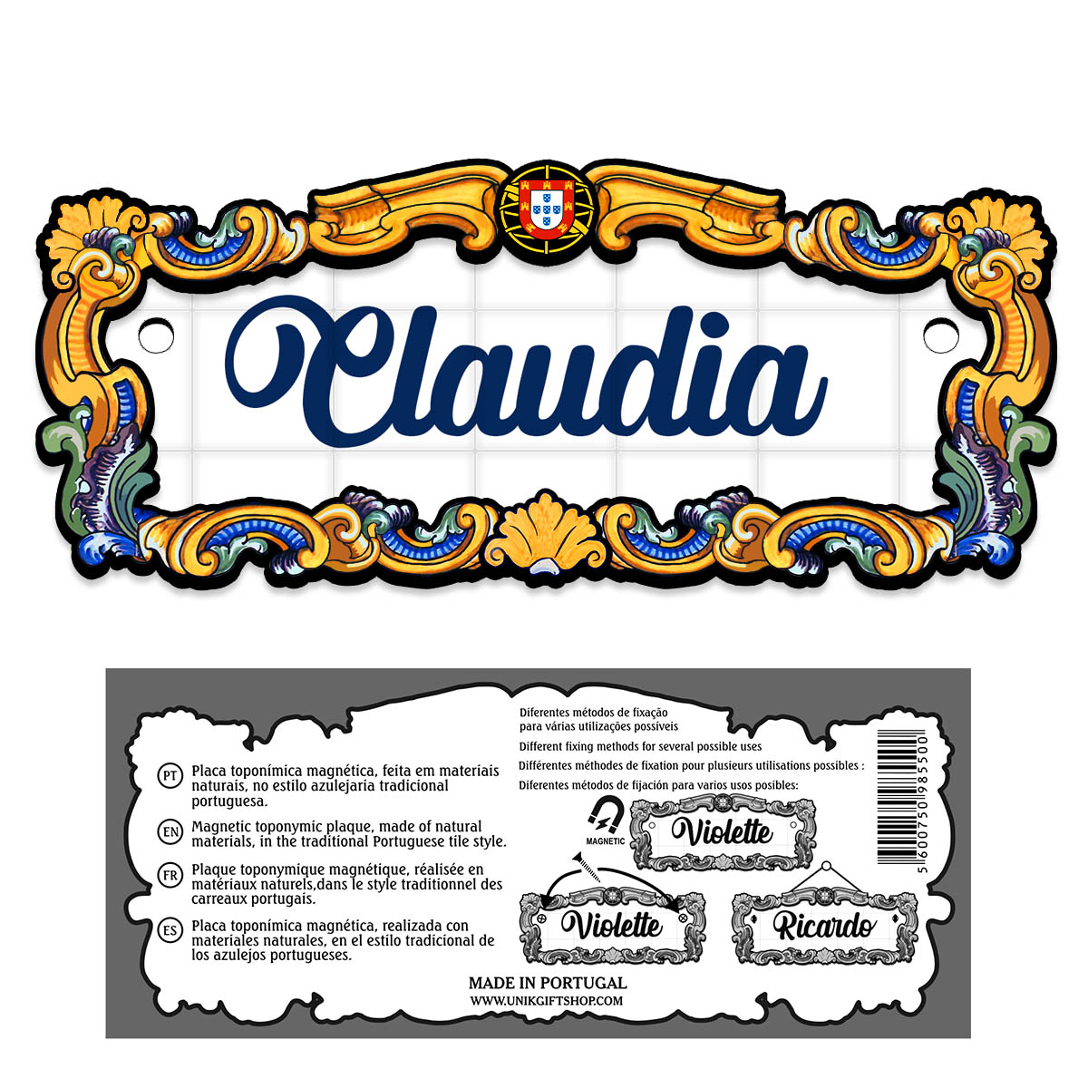 Magnetic toponymic plaque, made of natural materials, in the traditional Portuguese tile style, 14x6cm.