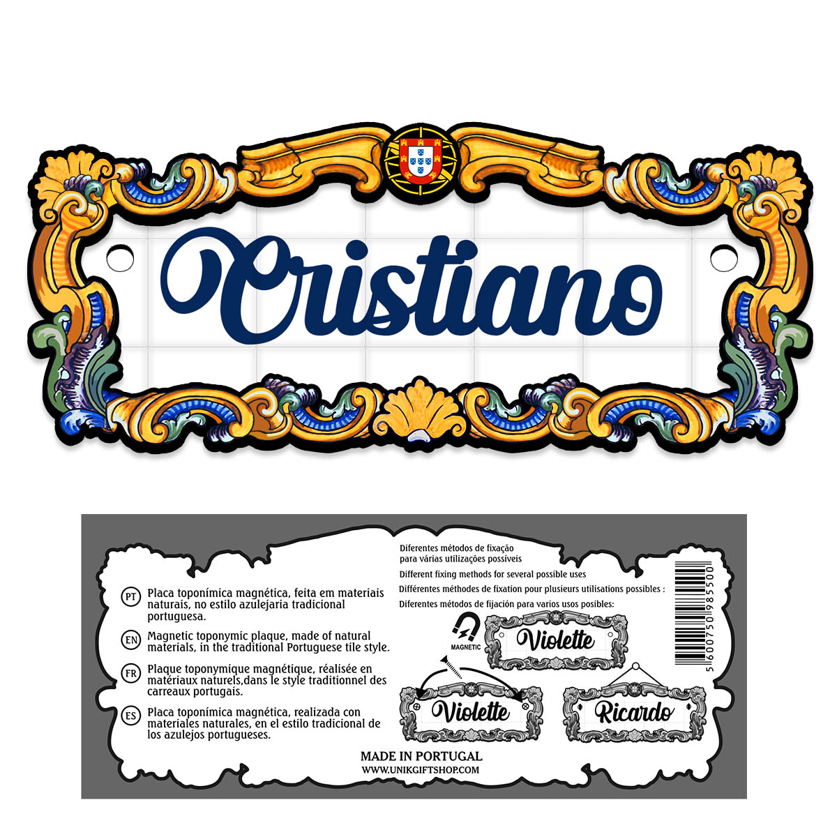 Magnetic toponymic plaque, made of natural materials, in the traditional Portuguese tile style, 14x6cm.