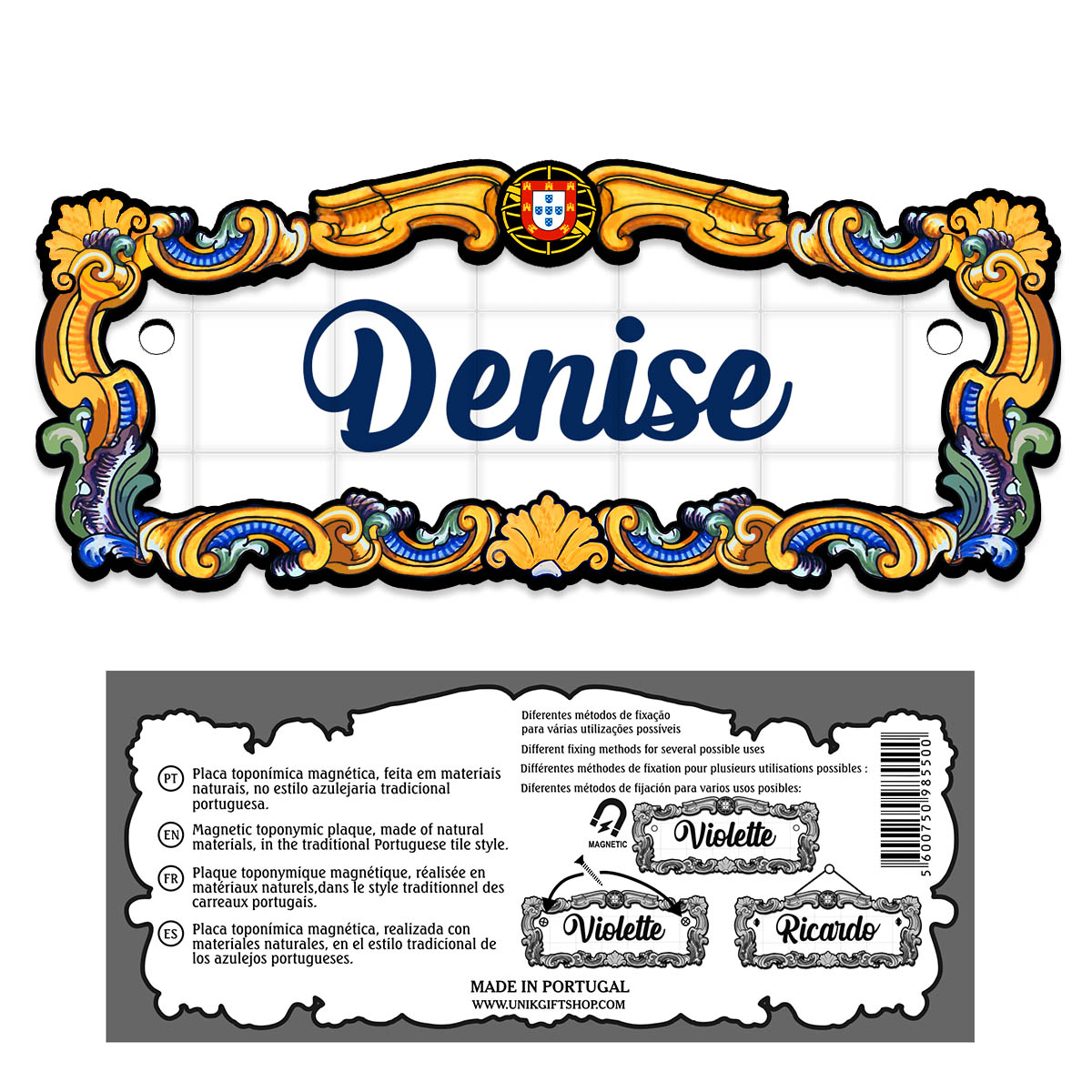 Magnetic toponymic plaque, made of natural materials, in the traditional Portuguese tile style, 14x6cm.