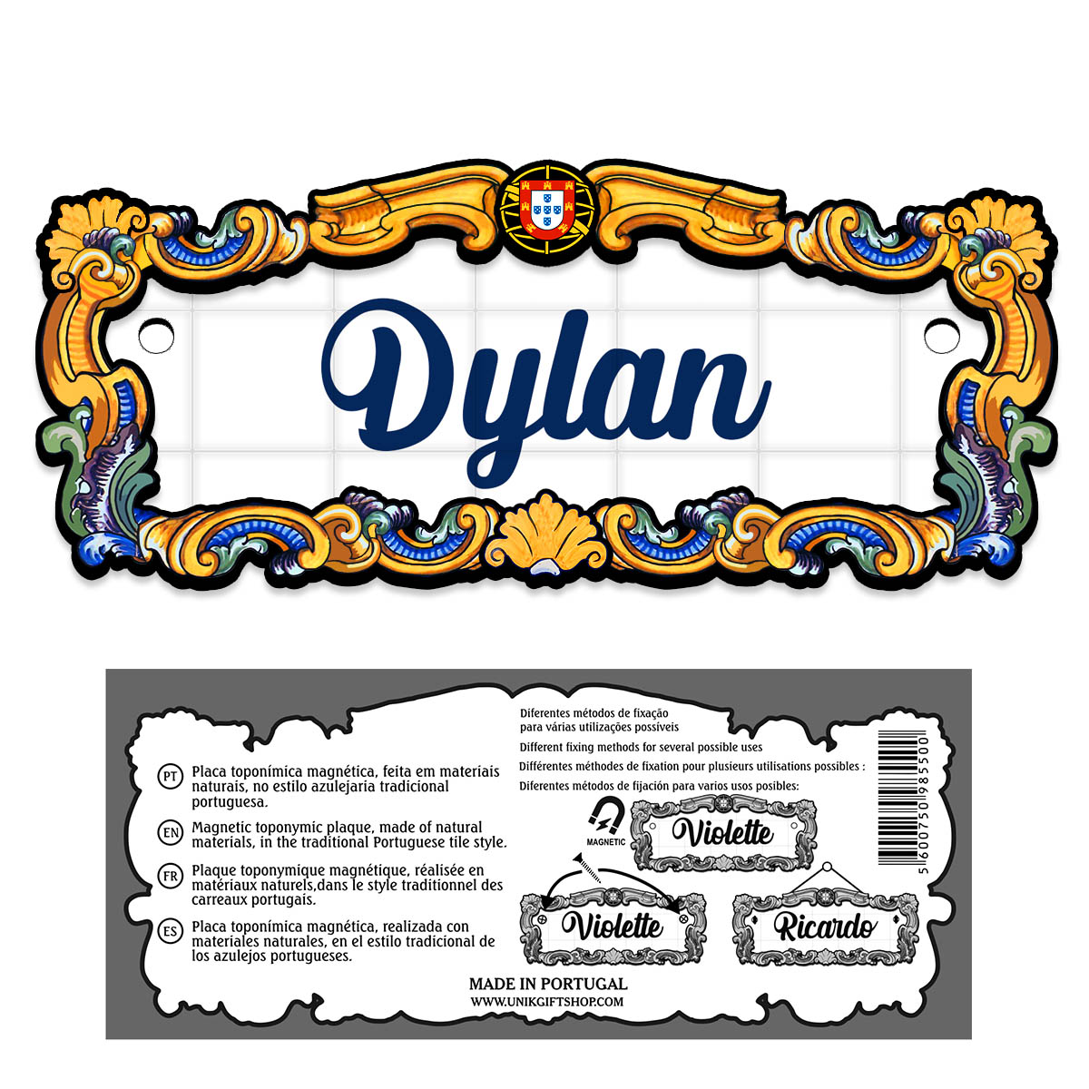Magnetic toponymic plaque, made of natural materials, in the traditional Portuguese tile style, 14x6cm.