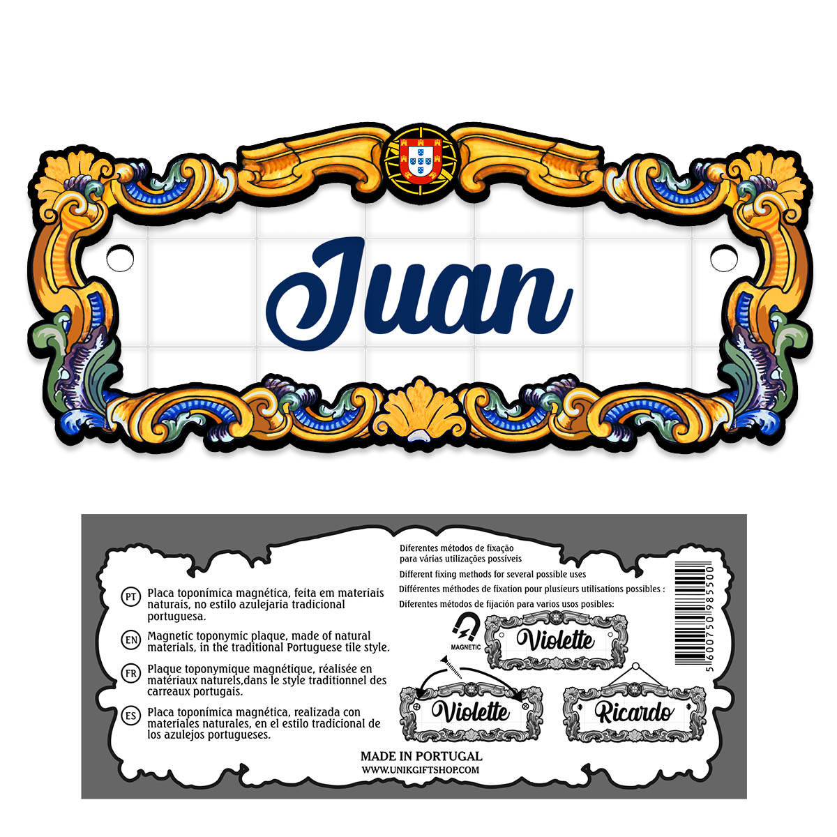 Magnetic toponymic plaque, made of natural materials, in the traditional Portuguese tile style, 14x6cm.