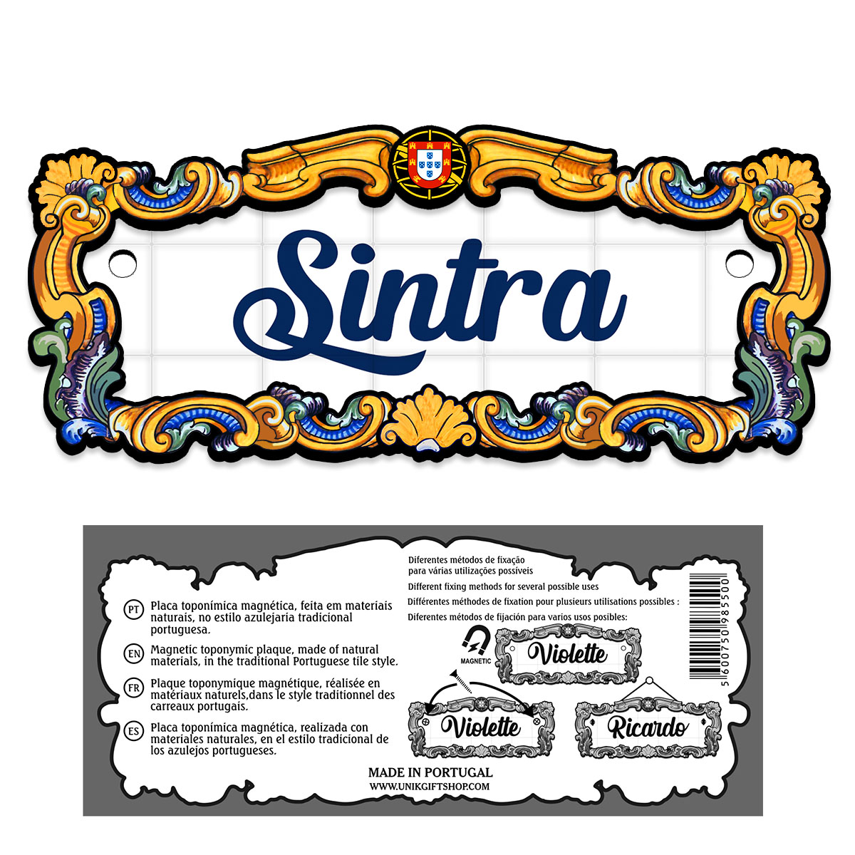 Magnetic toponymic plaque, made of natural materials, in the traditional Portuguese tile style, 14x6cm.