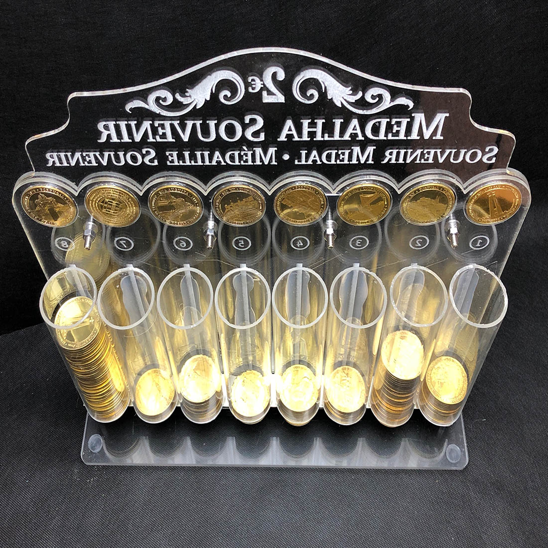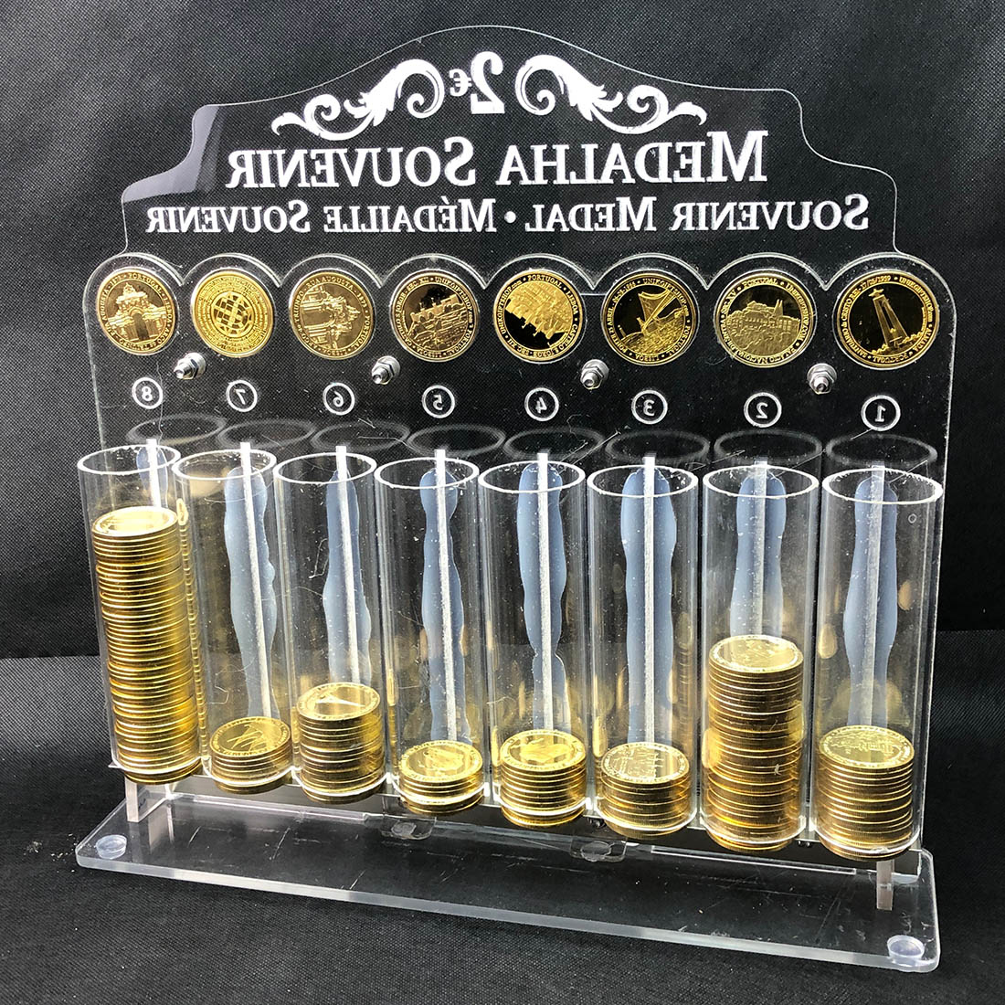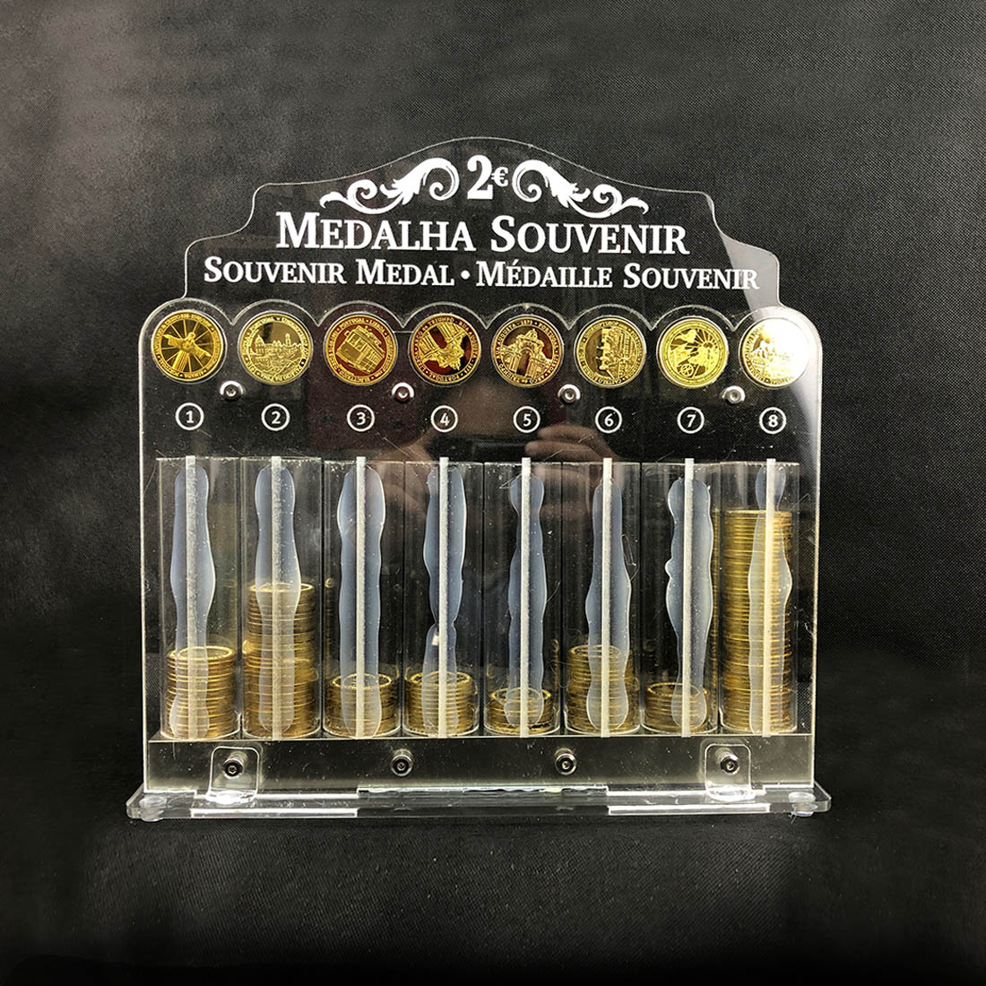 Tourist medal dispenser (medal with diameter 3.4cm), for 8 references, capacity 8 x 60 units = 480 units. Dimensions: 35 x 33 x 8cm Weight: 1kg